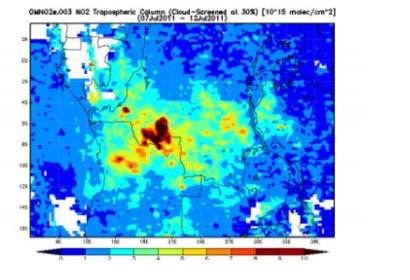 An image of the pollution from agricultural fires in central Africa was created from data of nitrogen dioxide (NO2) levels over the period from July 7 to 12, 2011. It was created from Ozone Measuring Instrument (OMI) data using the NASA Giovanni system by Dr. James Acker at NASA's Goddard Space Flight Center in Greenbelt, Md.