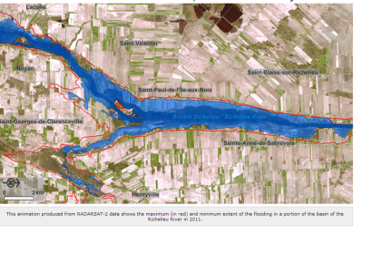 Through the new Rapid Information Products and Services (RIPS) initiative, the CSA’s Earth Observation Applications and Utilizations (EOAU) Division, in close cooperation with Public Safety Canada (PS) and Effigis, developed flood maps and geo-information products derived from the RADARSAT-2 and EO-1/ALI data. A time series animation of 16 RADARSAT-2 SAR images of the most severely flooded areas along the Richelieu River was also developed by the project team. This information serves geospatial information needs and requirements by federal as well as provincial stakeholder organizations, notably PS, the Sécurité Civile du Québec and Québec municipalities. The animation produced from RADARSAT-2 data showing the maximum and minimum extent of the flooding is accessible online.