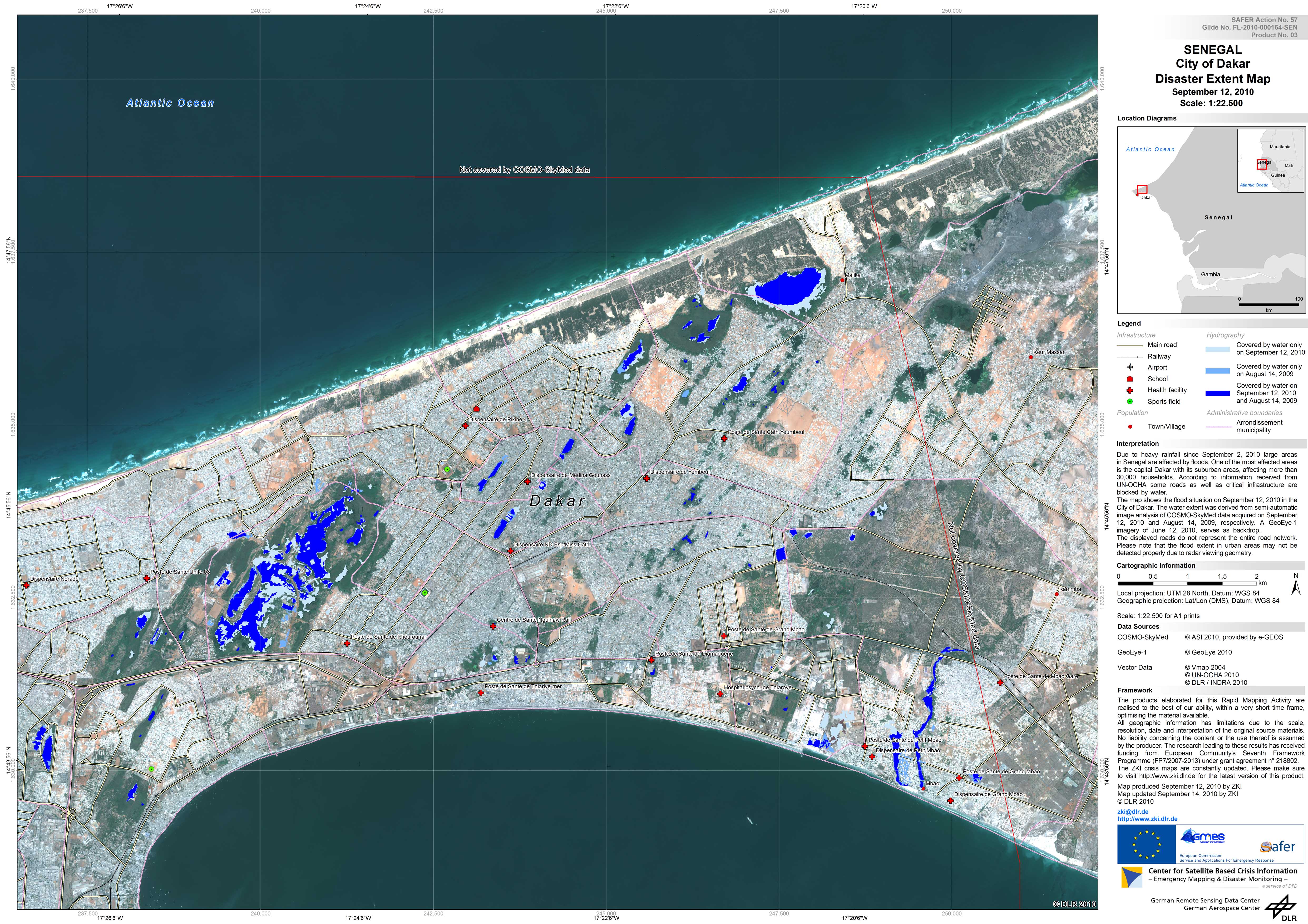 Due to flooding in Dakar caused by heavy rains, on 25 August 2013, the International Charter: Space and Major Disasters was activated to support Senegal with its flood response efforts. After a long period of drought ended in 2005, Senegal has been suffering from annual floods between the months of July and September, with the peak taking place in August.