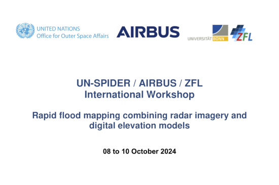 Between 8 and 10 October 2024, UN-SPIDER together with Airbus Defense and Space and the ZFL of the University of Bonn organized a technical workshop to discuss ways to combine these two sources of geospatial data to improve flood mapping procedures, including the UN-SPIDER flood mapping Recommended Practices. Experts from Airbus Defense and Space, the Joint Research Centre of the European Commission (EC-JRC), the Luxembourg Institute of Science and Technology (LIST), the Federal University of Santa Maria in Brazil, the German Federal Institute of Hydrology (BfG); and experts from space agencies of Algeria, Nigeria, South Africa; and other government agencies from Chile, Colombia, Germany, and Morocco; and researchers from Germany and the United Kingdom discussed ways to use digital terrain models to remove unwanted signals detected with radar imagery and to discuss ways in which different parameters extracted from digital terrain models can be used to assess the likelihood that selected pixels in radar imagery may be flooded.