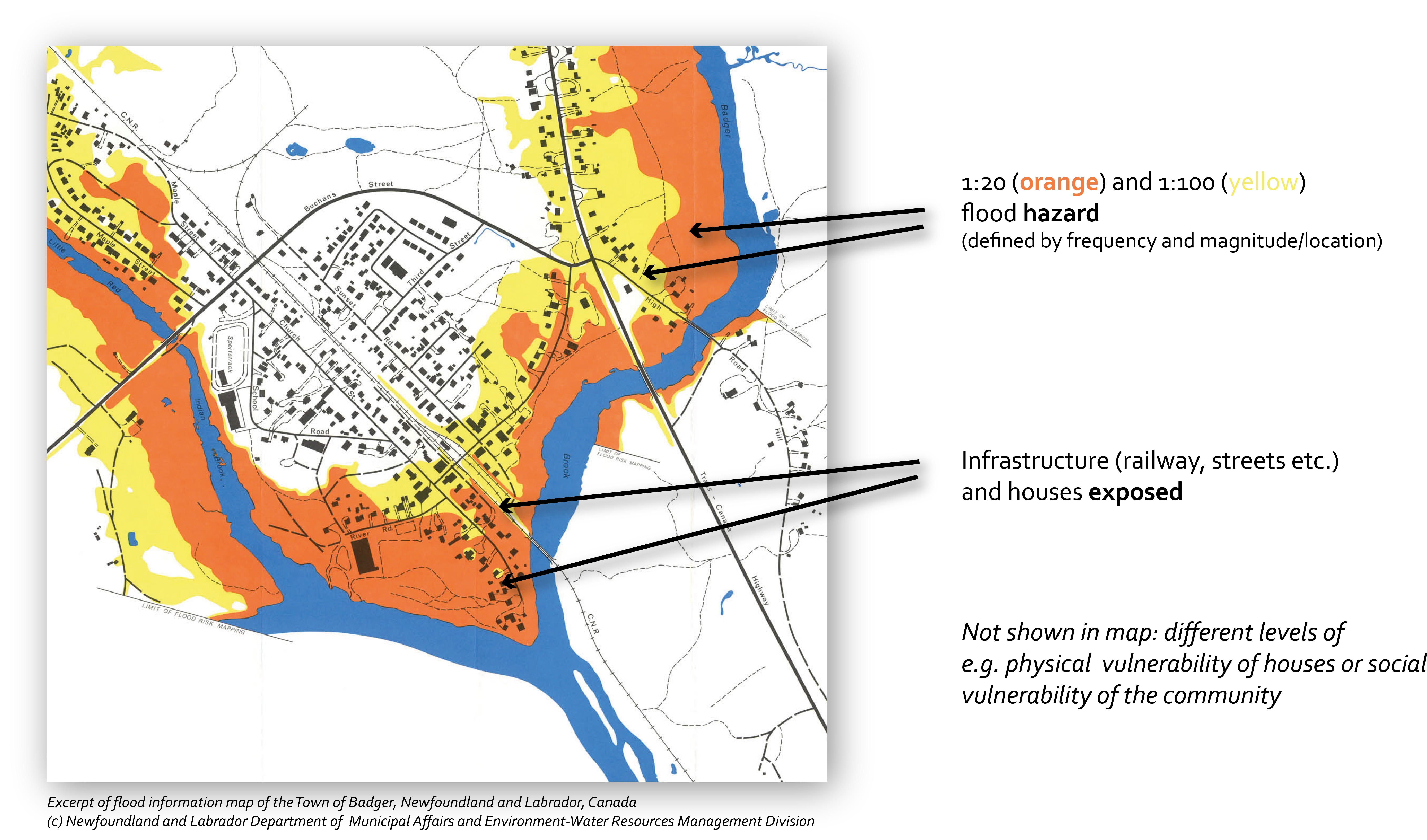 For example, when a settlement is established on the shores of a river, hydrologists can identify and characterise flood hazard by carrying out a hydraulic analysis. According to the UNDRR definition, a hazard is characterised by its "location, intensity or magnitude, frequency and probability”. In some countries, such hazard areas outline the geographic extent of floods that have a 100 year period of possible return. Any people, assets, infrastructure, and ecosystems located inside the area are all exposed to potential damage from floods. The degree of potential damage is then characterised by the area's vulnerability. For example, this can be defined by the physical structure of a building, as well as by the social and economic characteristics of a system. Additionally, hazard vulnerability can be characterised by the capacities of a society to cope with a hazard.